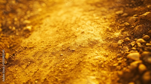 62.Close-up of a textured yellow soil path, with small scattered stones creating a natural, rough surface under soft, warm lighting.