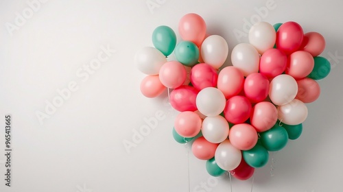 65. Decorative heart shape formed by multicolored balloons, including pink, white, and green, set against a simple background with room for copy