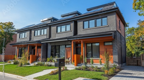 66.A pair of semi-detached houses featuring high-performance insulation, a clean and modern aesthetic, and a landscaped yard with native plants for water conservation.