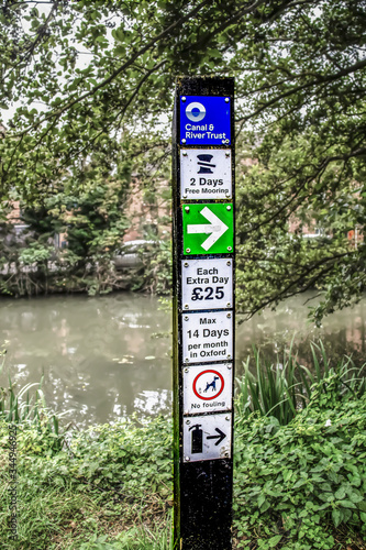 7-27-2019 Oxford UK - Canal & River Trust sign along the Oxford Canal tow path with costs and rules for mooring and dogs.jpg
