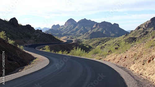 smooth, asphalt, road, winding, through, mountainous, terrain, tall, rugged, peak, rising, distance, dark, freshly, paved, clear, line, marking, lane, stretching, surrounding, rocky, infused, patch, greenery, scattered, mountainside, sky, bright, few, wispy, cloud, floating, wind, landscape, inviting, traveler, explore, majestic, mountain, rise