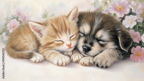 kitten, puppy, cuddling, together, clean, white, floor, soft, happy, expression, their, face, head, gently, resting, its, paw, curl, close, information technology, both, experiencing, eye, closed, creating, peaceful, harmonious, scene, warmth, friendship