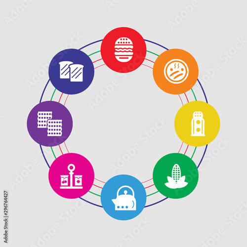 8 colorful round icons set included toast, biscuit, scales, kettle, corncob, salt shaker, sausage, burger