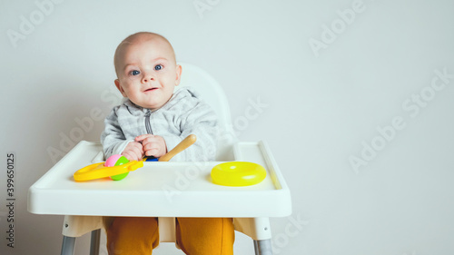 baby, infant, smile, sitting, high chair, toy, children, happy, joy, children, boy, cute, toddler, chair, childhood, high, rattle, smiling, plastic, little, table, healthy, home, caucasian, adorable, person, white, portrait, indoor, to sit, carefree, son, play, playing, development, children, room, babyhood, copy space, banner