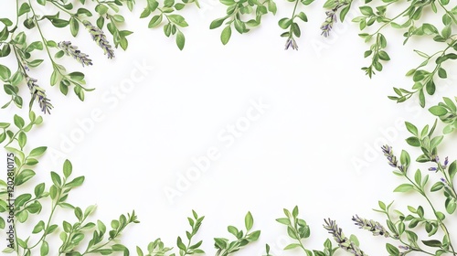 botanical, flat, lay, border, lavandula, sprig, intertwined, soft, green, leaf, elegant, rectangular, frame, crisp, white, canvas
