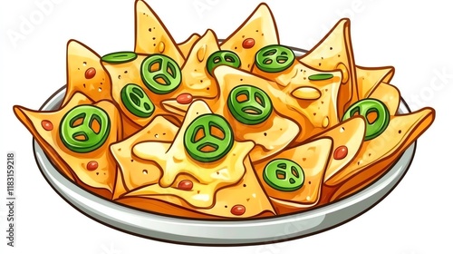 a 2D cartoon illustration of a plate of nachos with cheese and jalapenos, fun and spicy, white background--ar 16:9