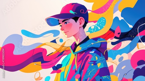 A 2d illustration of a cartoon guy sporting casual attire against a white backdrop with a vibrant and colorful design