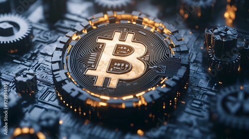 A 3D Bitcoin icon with the "₿" symbol floating in front of a digital background, the coin made of interlocking gold and silver gears