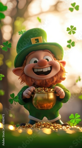 A 3D cartoon leprechaun with a big round face, chubby cheeks, and a tiny green hat