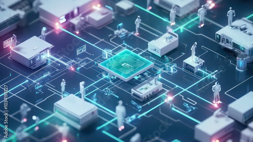 A 3D illustration of a futuristic city with glowing lines connecting buildings and people, symbolizing the interconnectedness of technology and society.