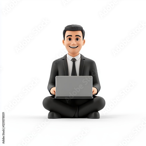 A 3D image of a smiling businessman engaged in work on his laptop