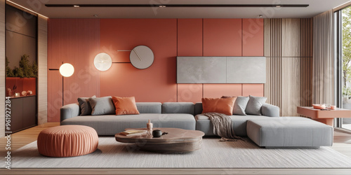 A 3D interior with light coral walls, offset by cool gray furniture. Subtle lighting adds warmth and depth to the modern, minimalist design.