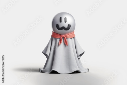 A 3D rendered silver sphere with a smiling face, wearing a grey ghost costume and coral neck scarf.