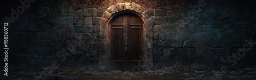 three-dimensional, rendering, creepy, dark, cellar, ancient, dilapidated, castle, entrance, sealed, wooden, door, roof, eerie, atmosphere, halloween, adventure, skittish, ghostly, haunted, abandoned, chamber, dungeon, horror, mysterious, shadowy, mediaeval, fortress, architecture, stone, dim, entranceway, secret, hidden, frightening, disused, ruin, decay, gothic, chilling, surreal, isolation, fear, terror, night, atmospheric, crypt, underworld