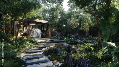 A 3D rendering of an expansive outdoor garden with lush greenery, modern landscaping, and a serene water feature