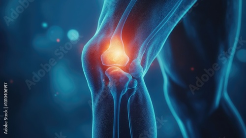 A 3D rendering of the human knee joint, showcasing pain in the cartilage and ligaments, ideal for educational or medical content.