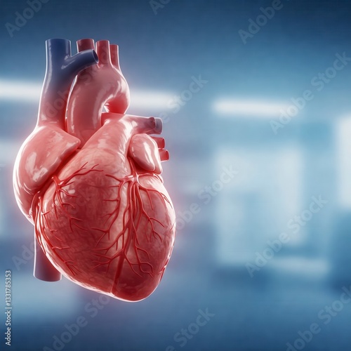 A 3D rendering or illustration of a human heart suspended against a blurred medical or clinical background, focused on anatomical detail.