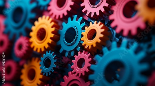 A 3D-rendered scene featuring a system of interlocking gears, each gear uniquely textured and colored to represent the diverse contributions of team members. The gears mesh together perfectly,