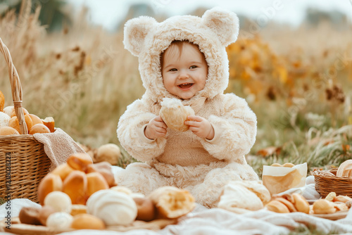 A baby in a bear costume is sitting on a blanket with a basket of food in front
