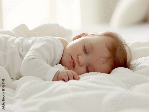 A baby in a white onesie sleeps peacefully on a white bed, soft light illuminates the scene.