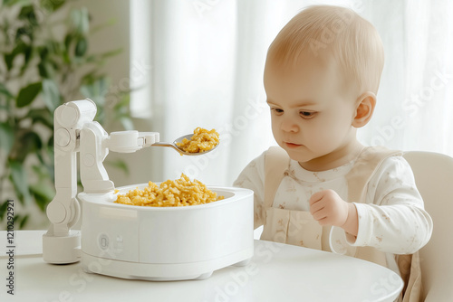 baby, robot, feeder, technology, futuristic, toddler, feeding, modern, innovation, parenting, automation, smart, device, interaction, cute, adorable, intelligent, development, family, meal, assistance, convenience, contraption, growth, education, ai, robotic, home, happy