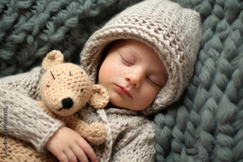 A baby is sleeping with a teddy bear