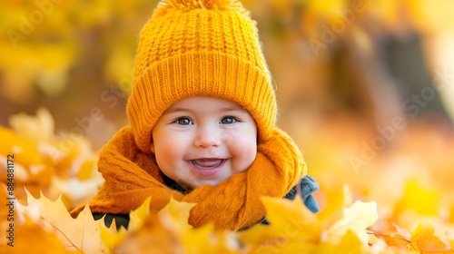 A baby wearing a yellow hat and a scarf is smiling in a pile of yellow leaves. The baby's smile and the bright colors of the hat and scarf create a cheerful and playful mood