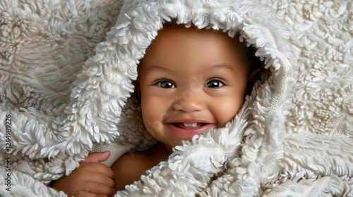 A baby with big brown eyes smiles at the camera while wrapped in a white blanket.