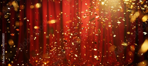 A background of a theater show stage with red curtains and golden particles flying with copy space for celebration.