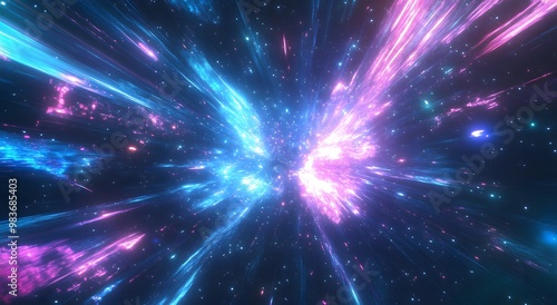 A background of neon light rays in blue and purple colors with an explosion effect on black,