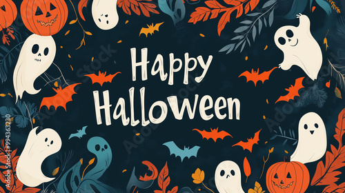 A background with hand-drawn skulls, bats, and ghosts framing "Happy Halloween" in the center, Background, flat illustration, Halloween