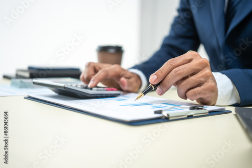 A banker in a suit works at a desk handling loans, analyzing client financial data, providing financial advice, dealing with stocks and the stock market, and studying economic situations.