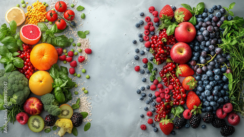 A banner showcasing an array of colorful fruits, vegetables and grains on the right side with space for text on a white background. On the left is a grey gradient background.