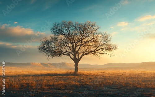A bare tree standing alone in a vast