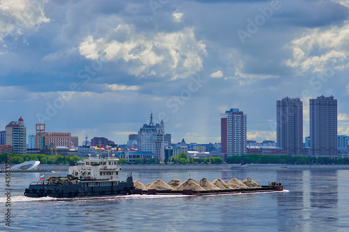 building material, barge, transport, cargo, towboat, sand, ship, transportation, shipping, vessel, industrial, freight, load, sailing, business, bank, heavy, large, moving, movement, trading, traffic, low, steel, fleet, loaded, port, carrier, blue, debris, gravel, rice, shoveling, commercial, loading, logistic, merchandise, motor, navigation, special, trip, trade, bulk, long, surface, cloud, amur, embankment