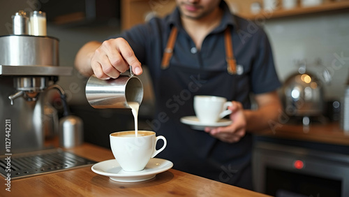A barista pouring creamy milk into a cup of freshly brewed coffee at a cozy café counter.
