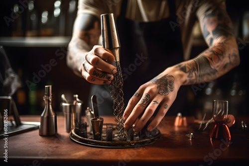 A bartender using specialized tools, such as muddlers and strainers, to create unique and intricate cocktails that delight the senses. Generative AI