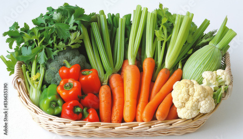 A basket of vegetables including carrots, cauliflower, and broccoli