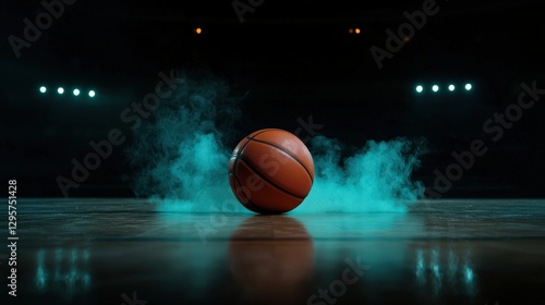 ball, basketball, sport, orange, brown, leather, court, floor, wood, arena, indoor, game, competition, league, play, equipment, sharpened, spotlight, illumination, glow, bright, darkness, smoke, vapour, blue, abstract, background, texture, dramatic, isolated, cinematic, stage, empty, studio, surface, center, front, nobody, round, detail, closeup, artistic, dynamic, modern, visual, realistic, atmosphere