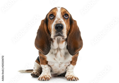 A basset hound dog sitting upright with floppy ears and a curious expression, showcasing its tricolor coat, isolated on a white background