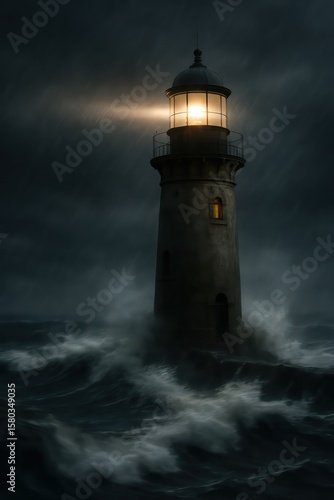 A beacon of hope and guidance, a solitary lighthouse stands tall amidst a tempestuous sea. The beam of light cuts through the stormy darkness.