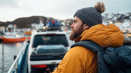 man, beard, travel, ferry, vehicle, harbor, jacket, yellow, adventure, journey, winter, contemplation, maritime, voyage, exploration, ocean, cold, cloudy sky, thoughtful, freedom, calmness, sea, transportation, tour tourism, water, distant, contemporary, realistic, commute, modern, wanderlust, backpacker, urban, peace