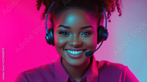 A beautiful African European woman, customer service or sales agent with a headset, smiling to the camera in a call center office background.