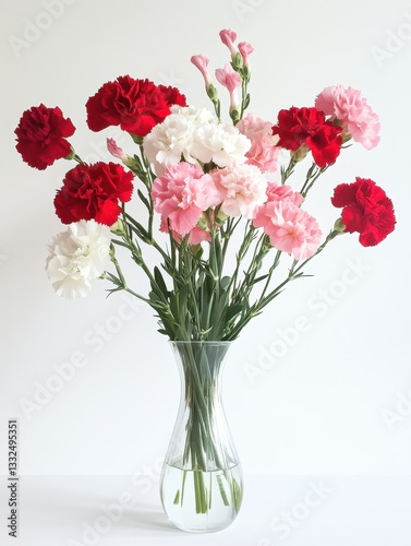 A Beautiful Arrangement of Colorful Carnations in a Glass Vase on a White Background Perfect for Celebrations and Decorative Purposes