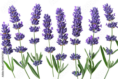 A beautiful arrangement of vibrant purple lavender flowers, showcasing their delicate petals and green leaves, perfect for gardens and floral designs.