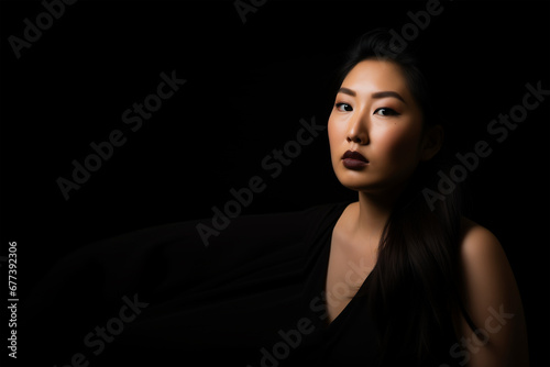 asian ethnicity, person, portrait, female, lady, woman, one person, foreigner, black background, black back, dress, fashionable, stylish, fashion, coordinate, beauty, make up, make-up, make-up, cosmetic, model, pose, posing, beautiful, pretty, beautiful woman, black, dark hair, glamour, copy space, asian, generative, ai