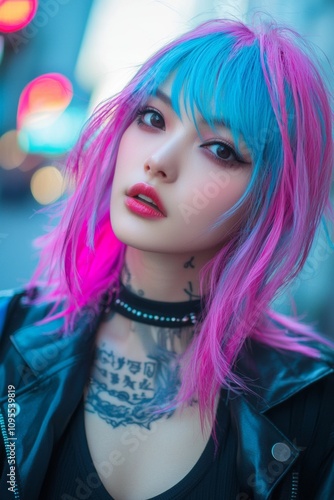 female, woman, beauty, person, fashion, model, hair, face, people, 1, looking, eye, teenage, glamour, posing, make-up, outdoors, style, street, light, blurred, bokeh, pink, blue, asian, japanese, korean, chinese, tattoo, punk, dye, colours, colourful, wild