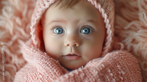 A beautiful baby with striking blue eyes gazes inquisitively from a soft pink blanket, radiating innocence and warmth in an enchanting newborn portrait.