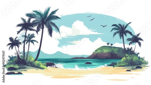 beautiful, beach, scene, palm, tree, body, water, sky, blue, bird, flying, background, peaceful, relaxing, summer, sea, travel, nature, island, vacation, landscape, paradise, sand, tropical, ocean, seascape, illustration, vector, holiday, tree, coast, resort, exotic, relax, sun, sunny, shore, season, horizon, wave, tour tourism, flat, day, cartoon, design, transparent