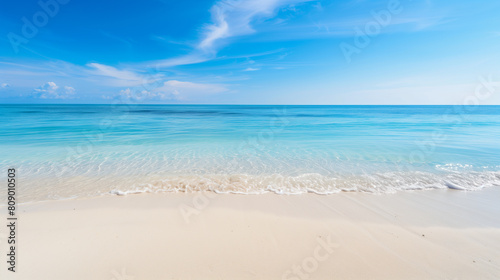 A beautiful beach with a clear blue ocean and a few small islands in the distance. The sky is mostly clear with a few clouds scattered throughout. The scene is peaceful and serene, with the calm ocean